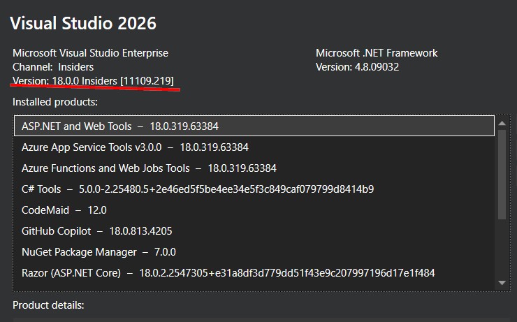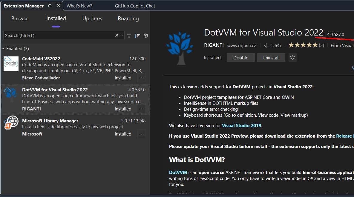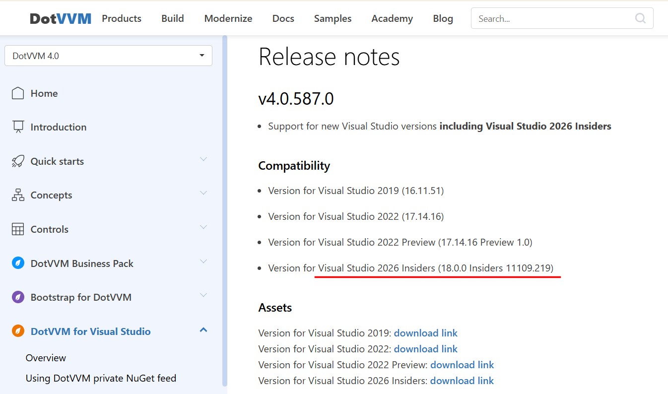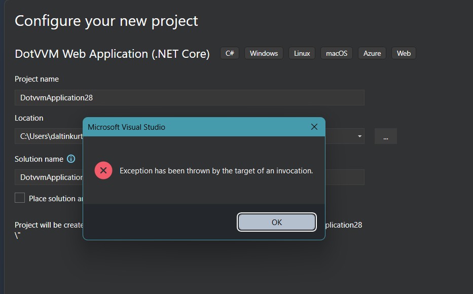 DotVVM extension for Visual Studio 2026 Insiders (18.0.0 Insiders 11109.219) error